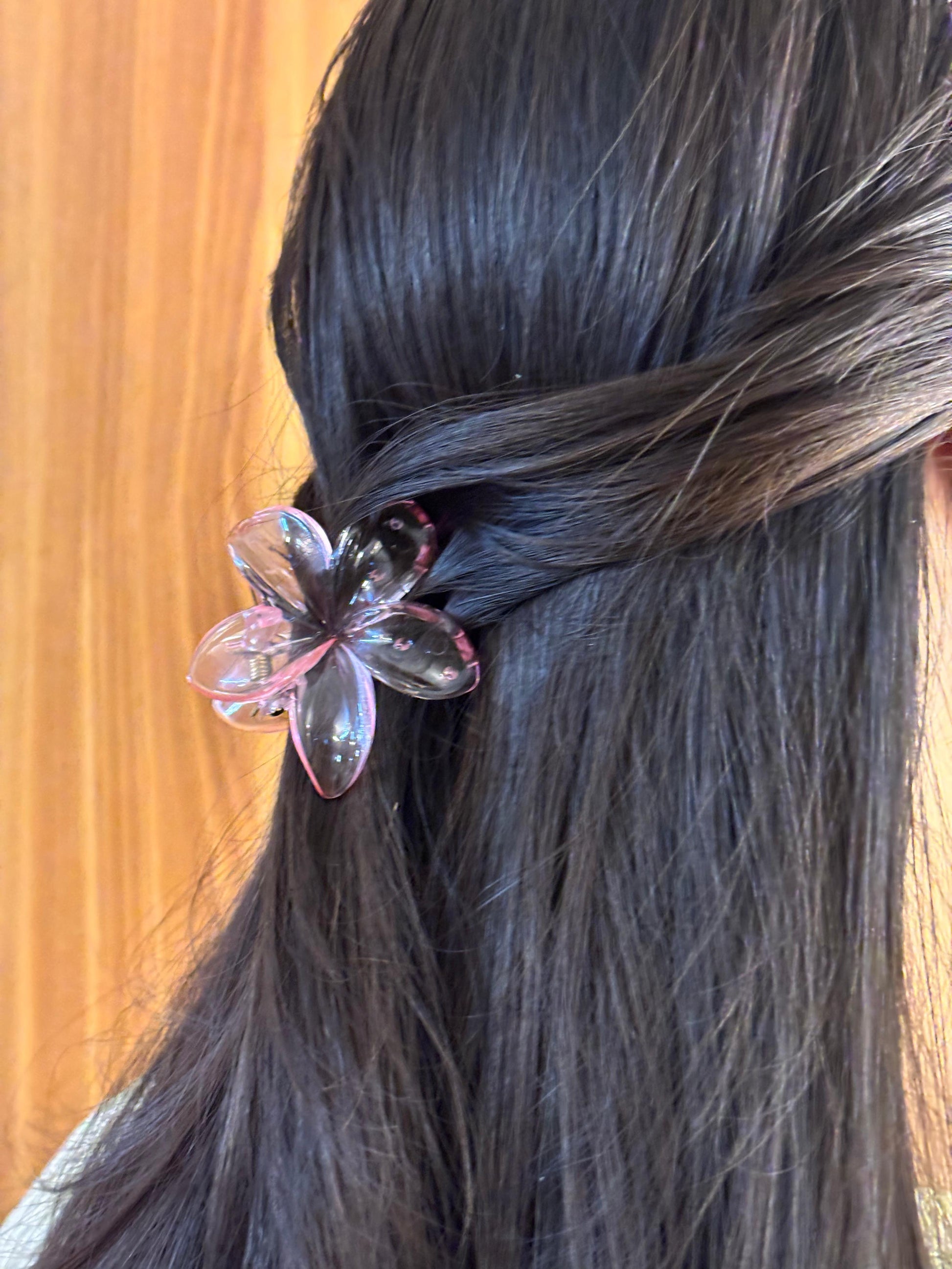 - Pink translucent flower hair clip β Glossy floral-shaped hair clip with a soft translucent finish.